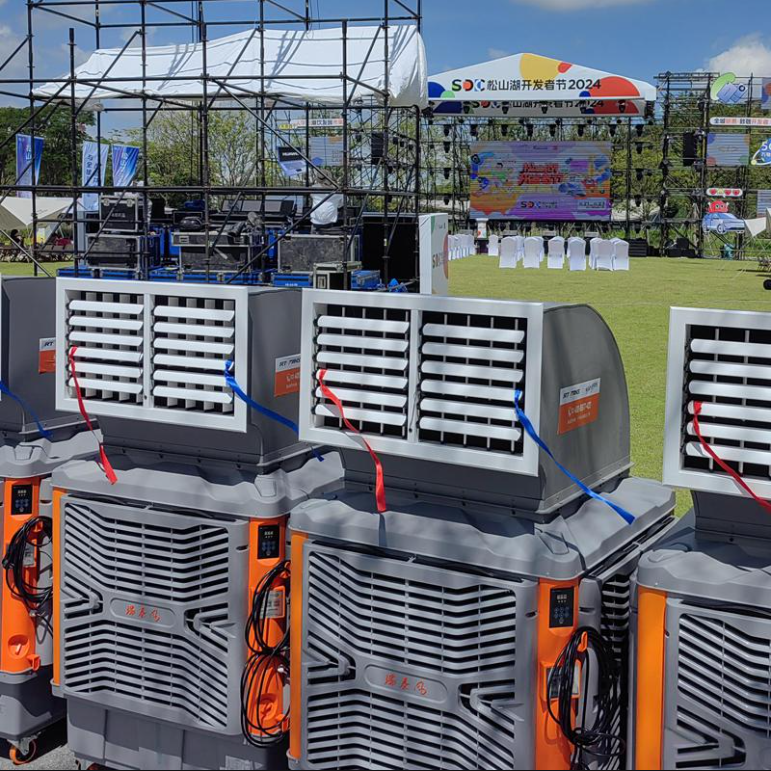 瑞泰風推出的RTF-20Y型移動式冷風機,是一種集降溫、換氣、防塵、除味于一身的蒸發(fā)式降溫換氣機組,可在廣場、排隊區(qū)、露天餐廳等開放空間形成均勻穩(wěn)定的清涼氣流。相較于傳統(tǒng)噴霧降溫設備,該產品不僅降溫效果更持久,還能智能調節(jié)濕度,有效避免“蒸籠效應”,提升體感舒適度。