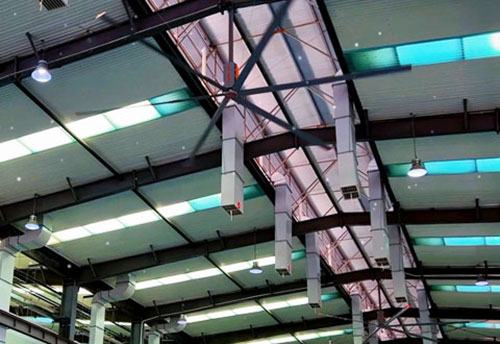 3.空間利用與美觀性,工業(yè)大風扇安裝于室內屋頂下的高空之上,不占用任何地面、墻體面積,非常節(jié)省空間,且美觀、大氣,扇機組合無需在建筑屋面或墻體上進行大規(guī)模的改造和開孔,不會破壞建筑的原有結構和外觀,有利于保持建筑的安全性和美觀性,特別適用于對建筑屋面承重安全性、空間美觀性有要求的大型室內生產(chǎn)工作場所。